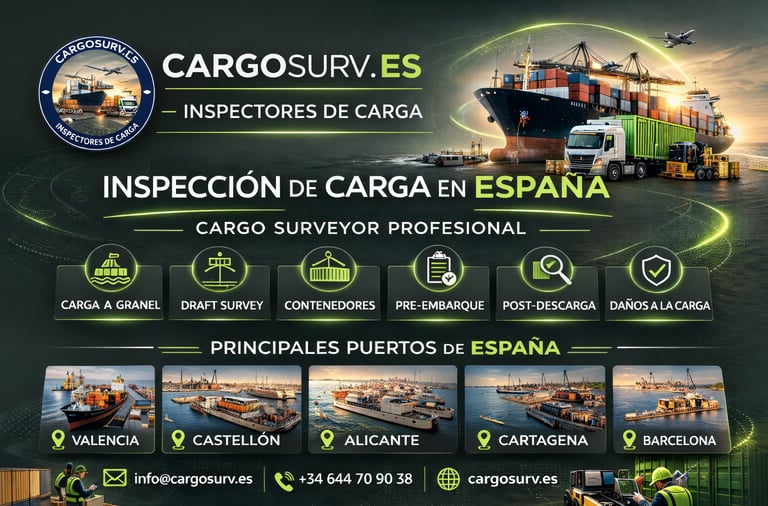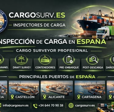 Servicios profesionales de inspección de carga en España. Cargo surveyor independiente en puertos españoles. Draft survey, daños y control de mercancías.